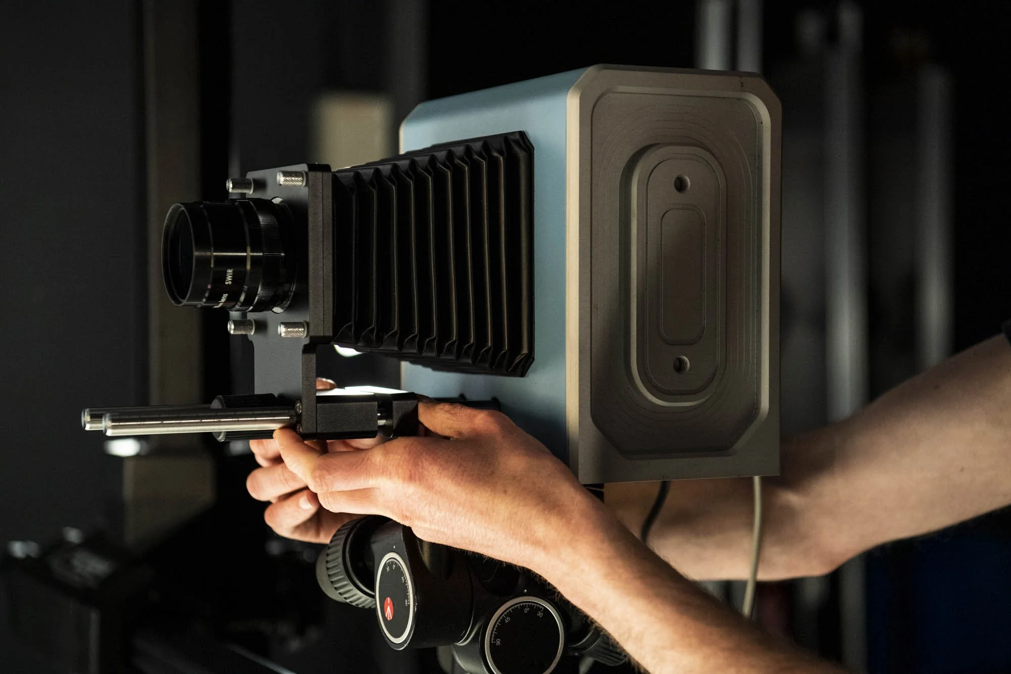 A person adjusting a large vintage camera with a bellows lens, mounted on a tripod.