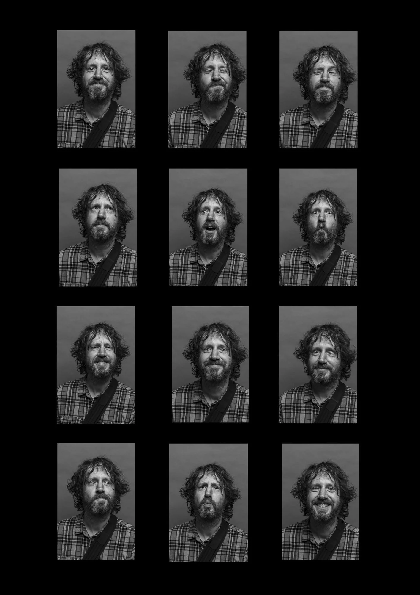 Series of twelve black and white portrait photos of a man with curly hair and a beard, making various facial expressions and poses.