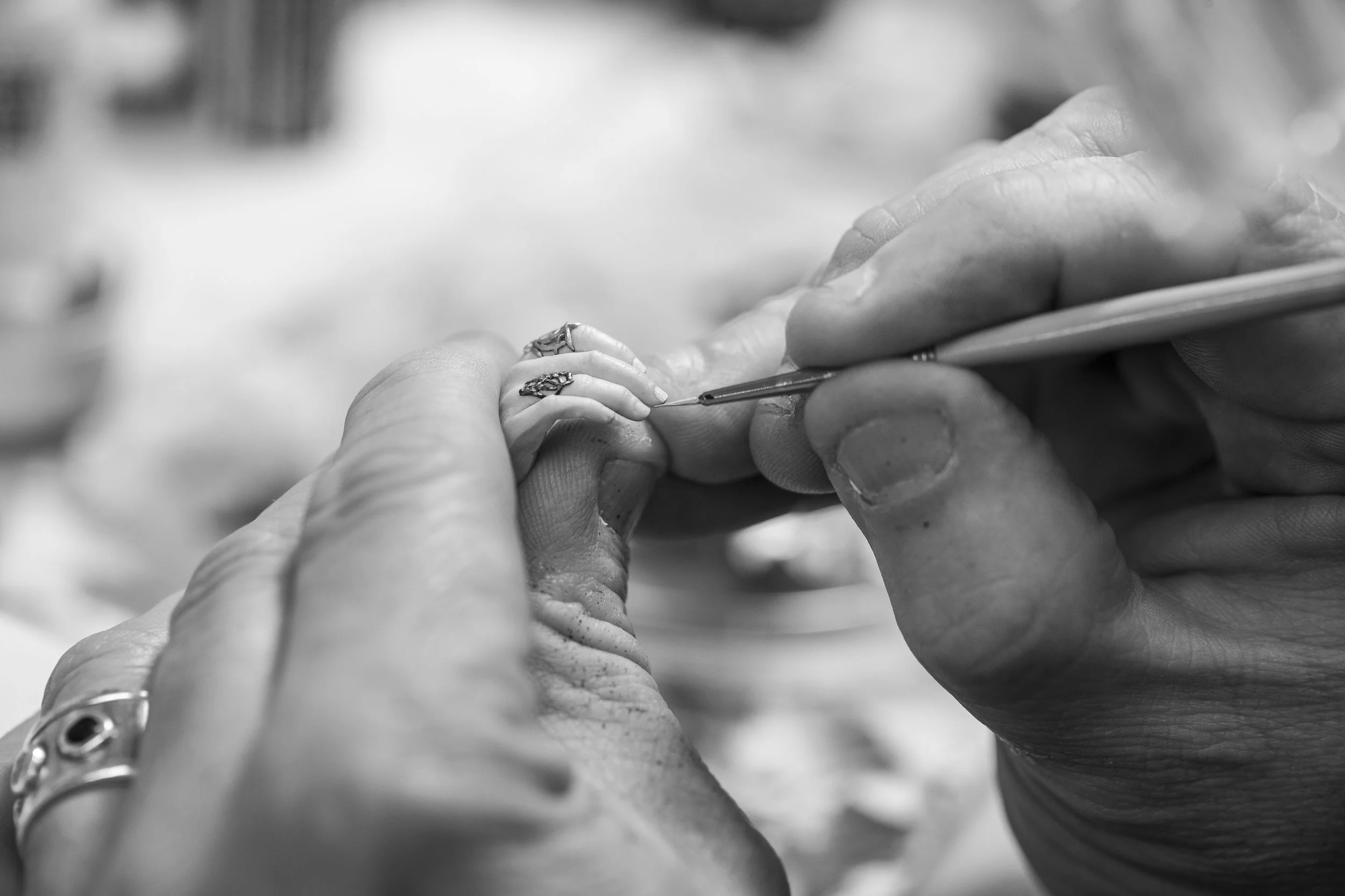A person's hand is holding a tiny figurine's finger steady while another hand uses a fine tool to paint or decorate it.