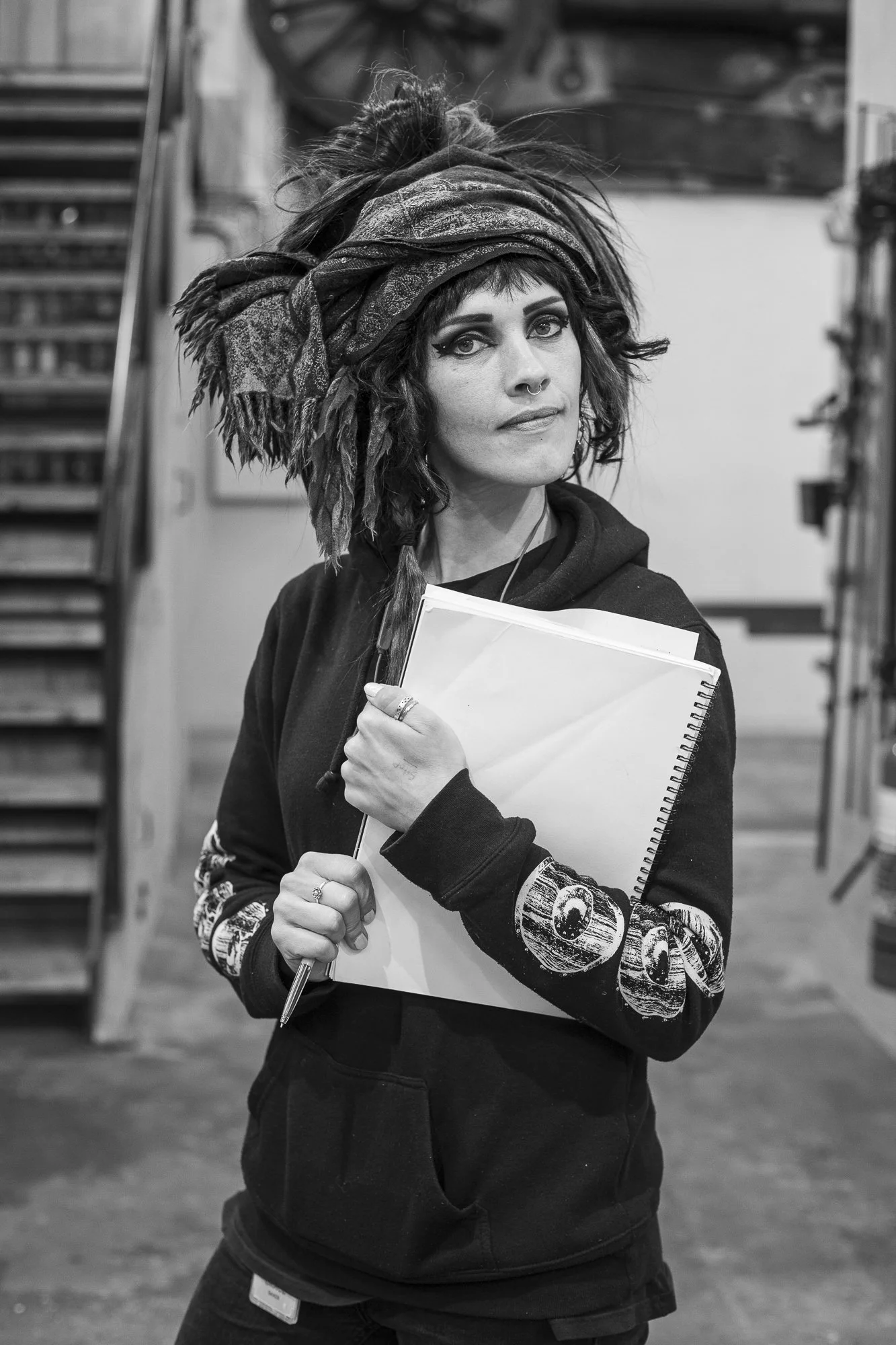 A woman with curly hair wearing a large headscarf and dark hoodie, holding a notebook and pen, standing indoors near a staircase.