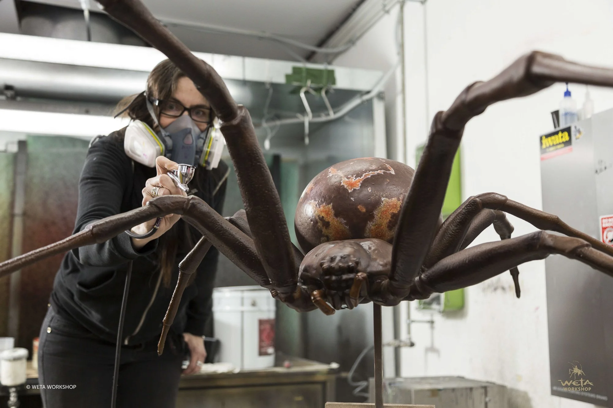 A person wearing a mask, glasses, and gloves is spray painting a large, realistic model of a spider in a workshop.
