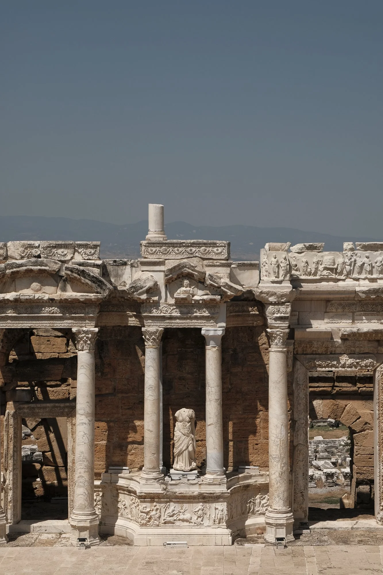 Ancient ruins featuring marble columns and a statue, with additional architectural fragments and a clear sky in the background.