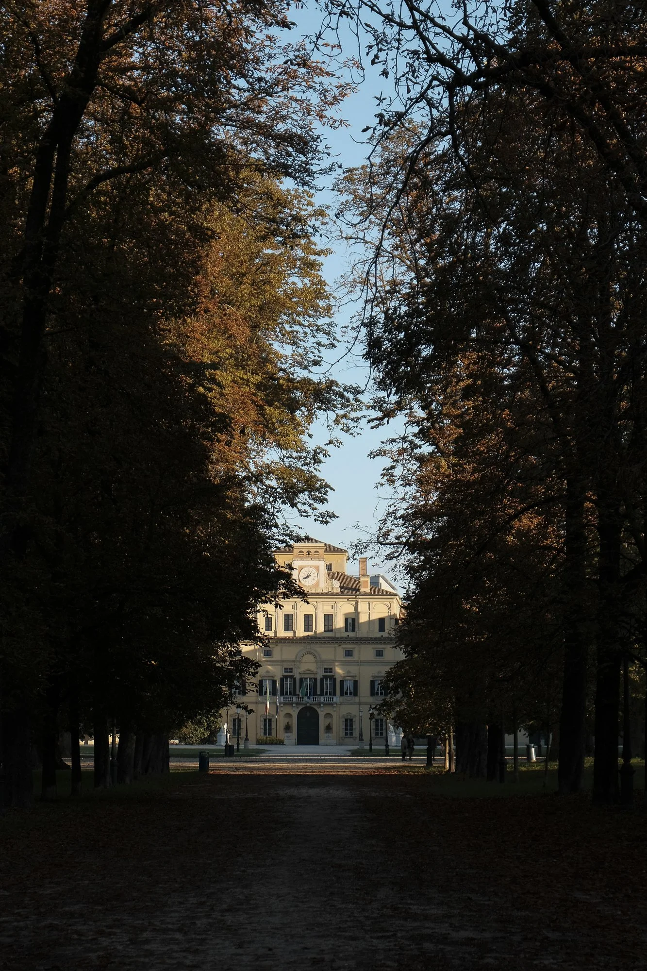 A historic building illuminated by the setting sun, framed by tall trees with leaves turning autumn colors, and a pathway leading towards the building.