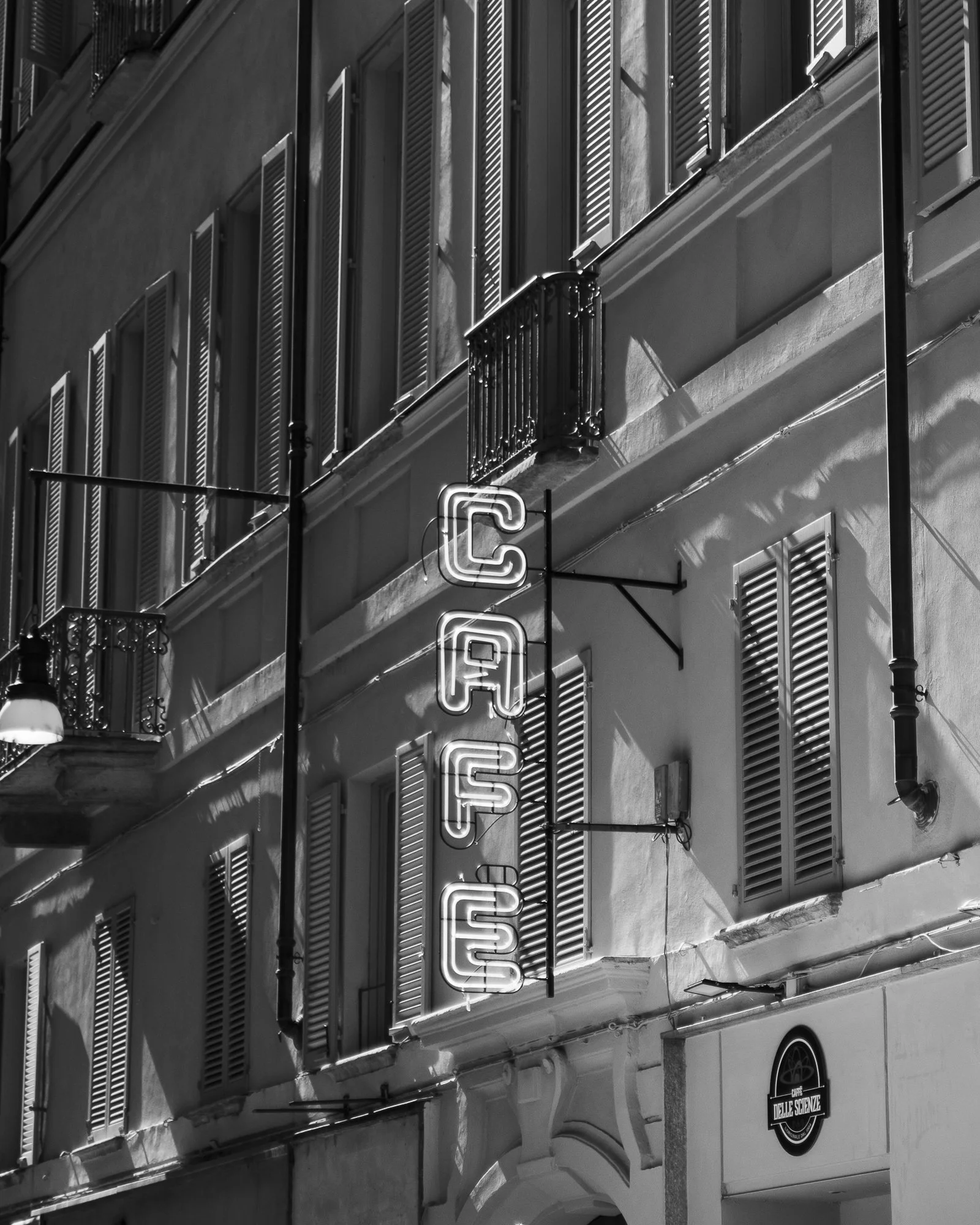 Black and white photo of a building facade with multiple windows with shutters, a balcony, and a neon sign that reads 'CAFE' hanging on the wall.