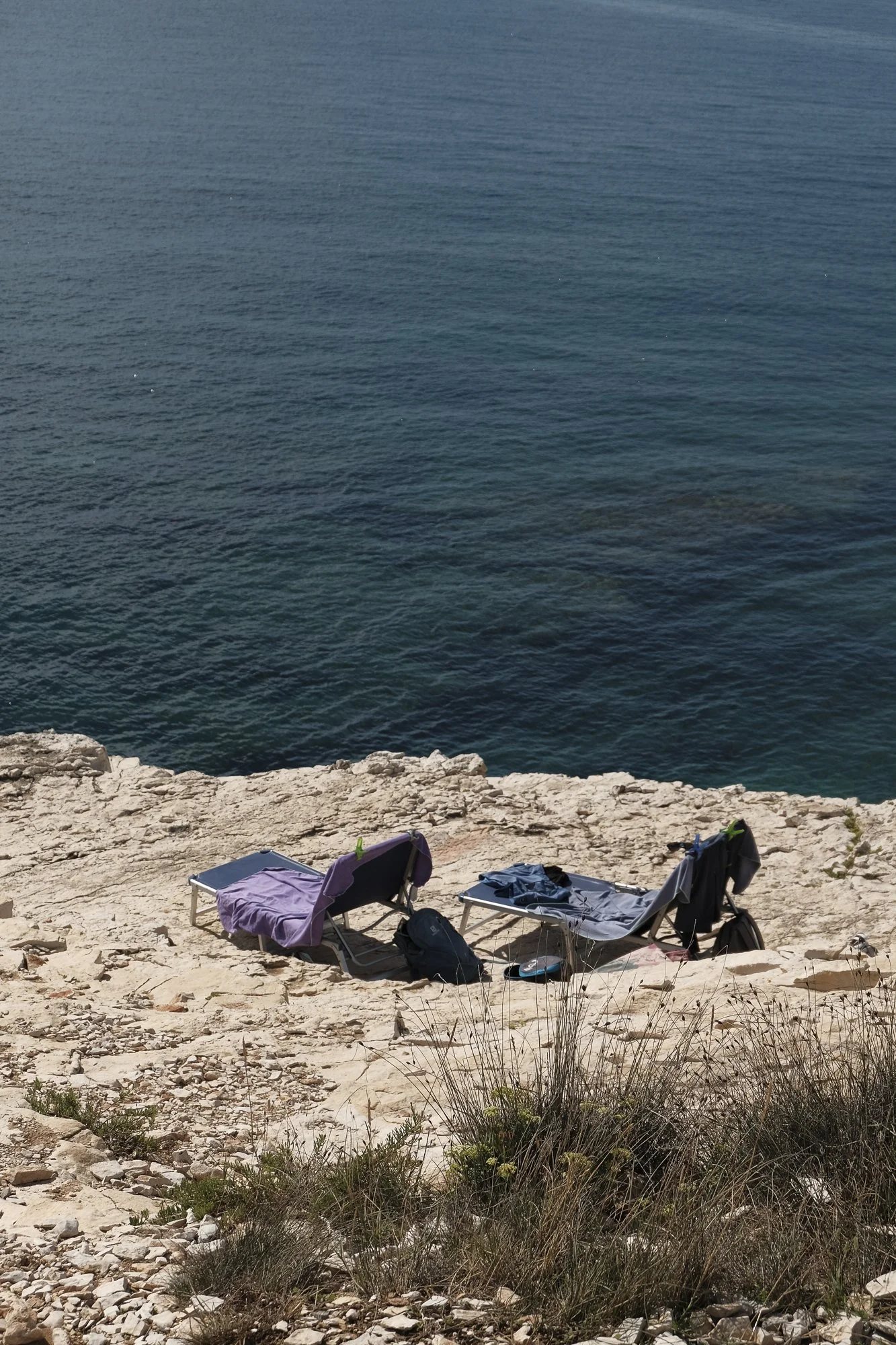 Two lounge chairs on a rocky beach near the water with clothing and backpacks placed on and beside them.