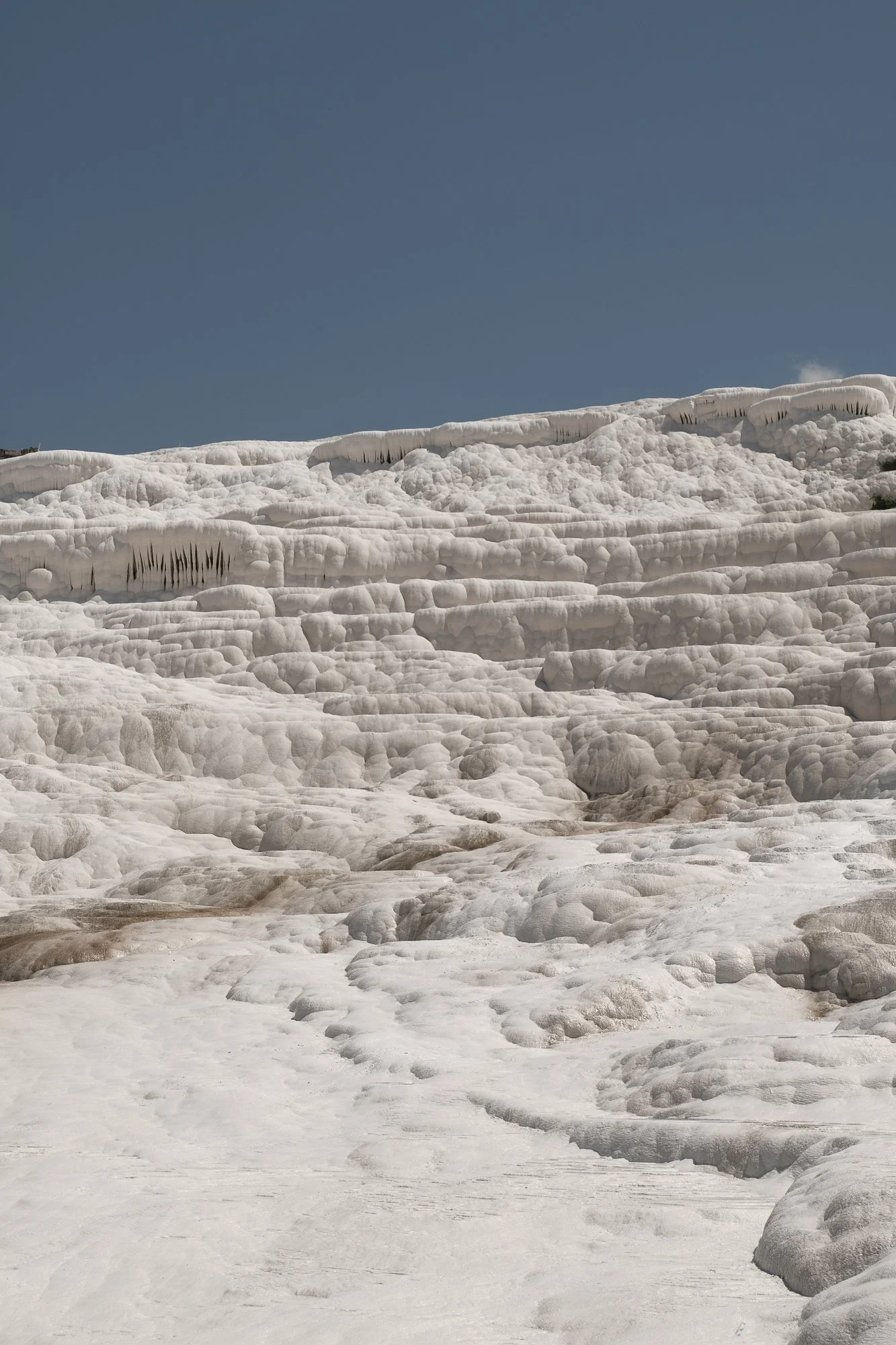 White travertine terraces with a blue sky in the background.