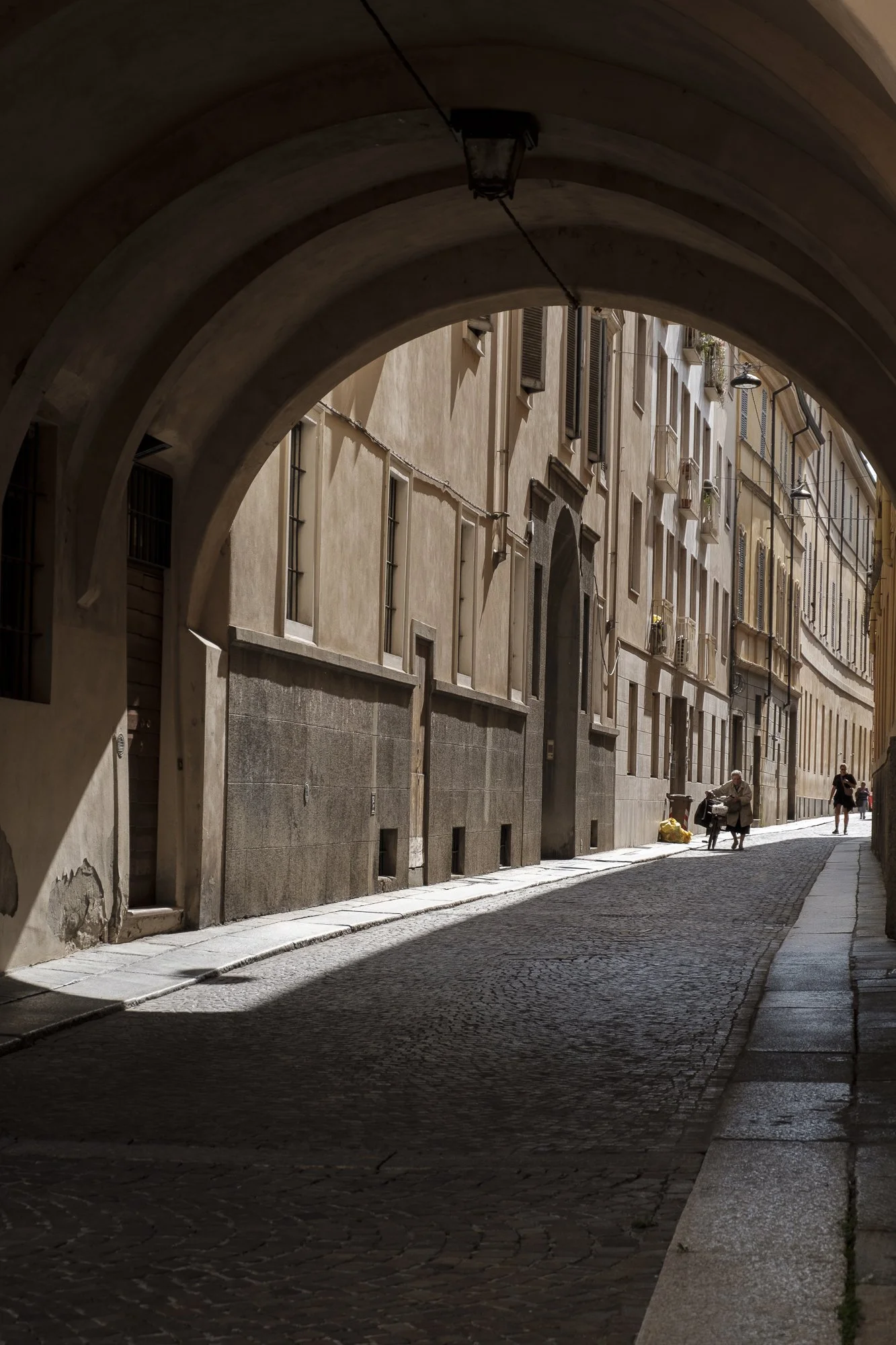A narrow street in a European city, view from under an archway, with sunlight casting shadows on cobblestone pavement, old buildings with shuttered windows, a person sitting on a bench, and a few pedestrians walking.