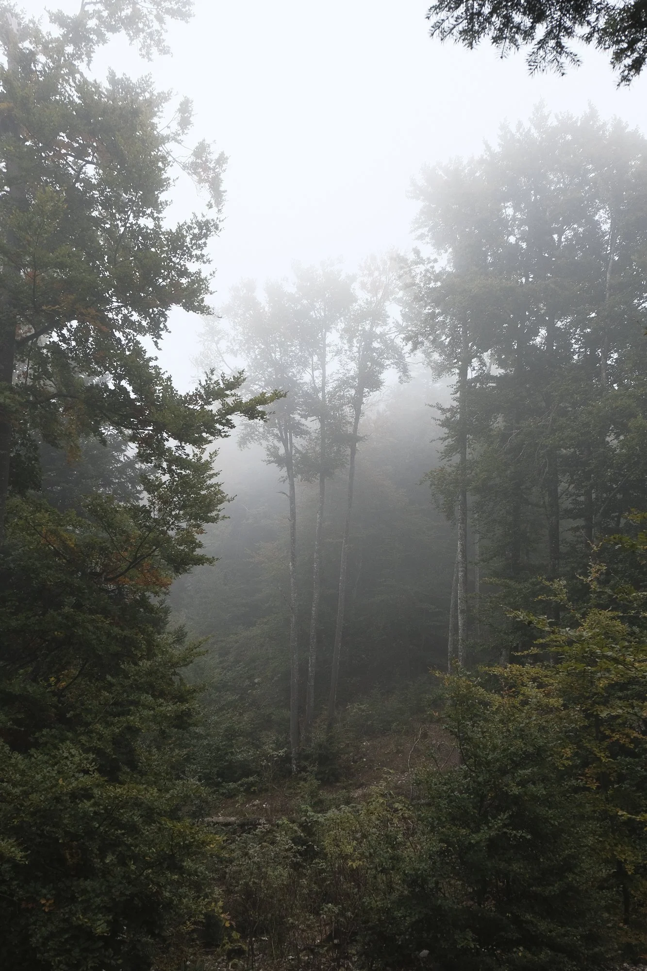 A foggy forest with tall trees and dense greenery.