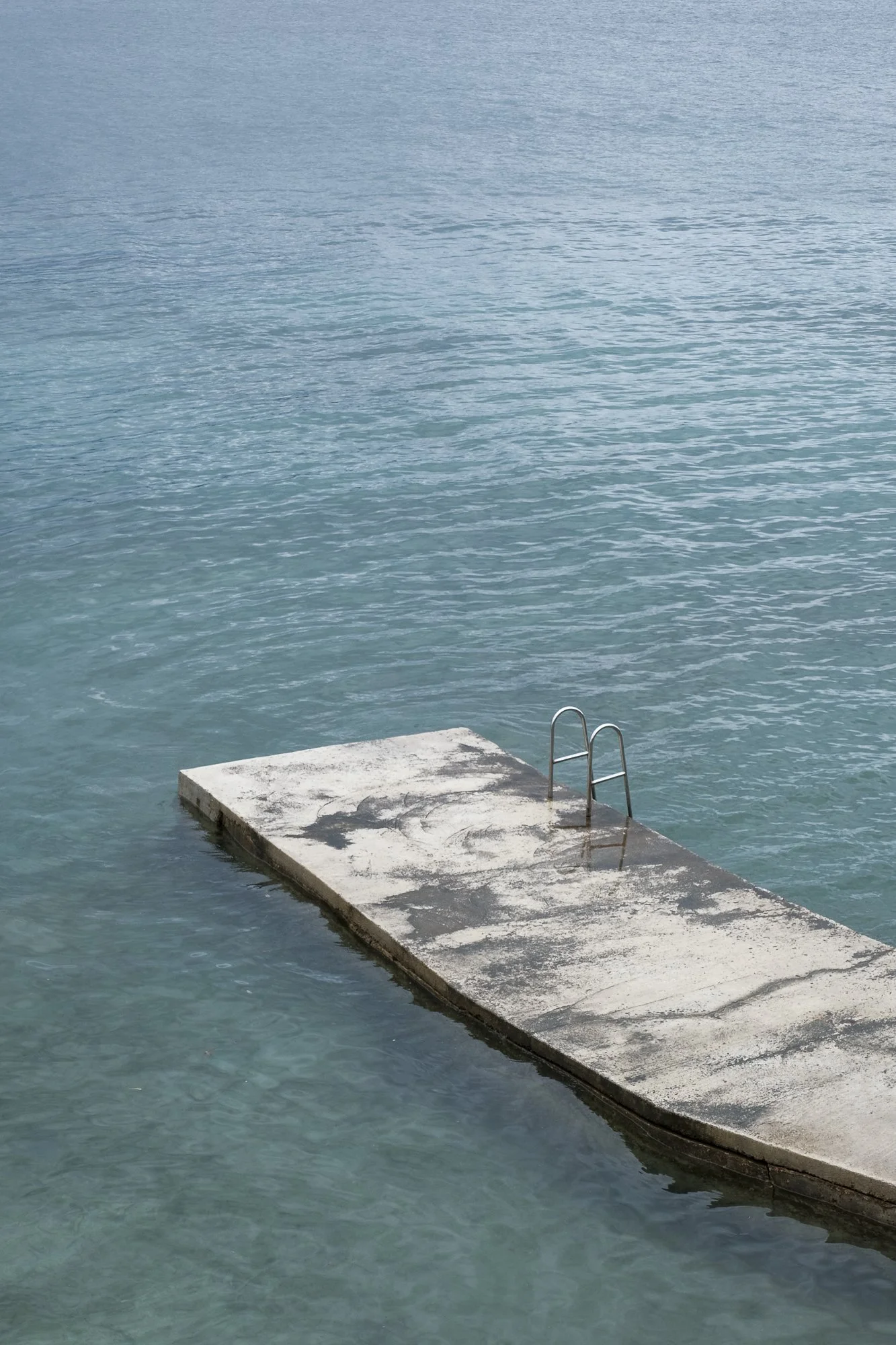 Empty swimming pool ladder on a concrete poolside dock extending into a calm body of water.