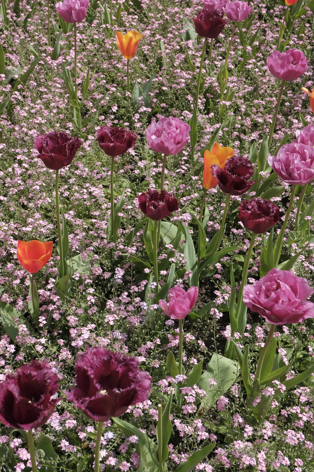 A vibrant garden bed filled with pink, dark purple, and orange tulips, surrounded by tiny pink flowers.