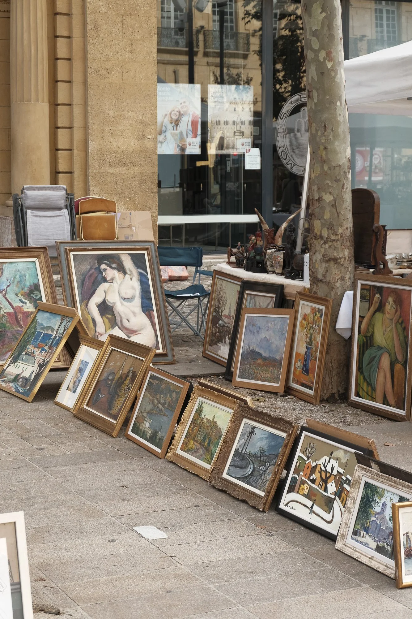 Street art display with multiple framed paintings leaning against a tree and sidewalk, featuring portraits, landscapes, and abstract art.