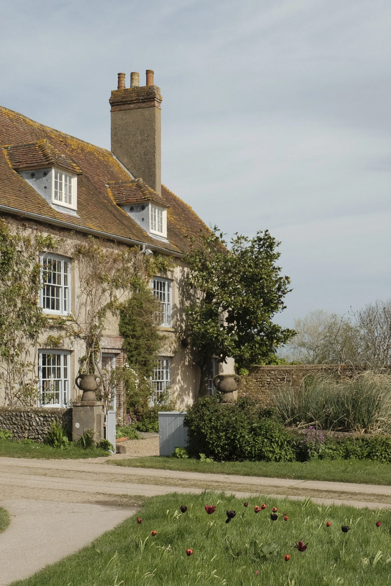 A charming countryside house with ivy-covered walls, white-framed windows, and a tiled roof, surrounded by a well-maintained garden with flowering plants and a grassy area.