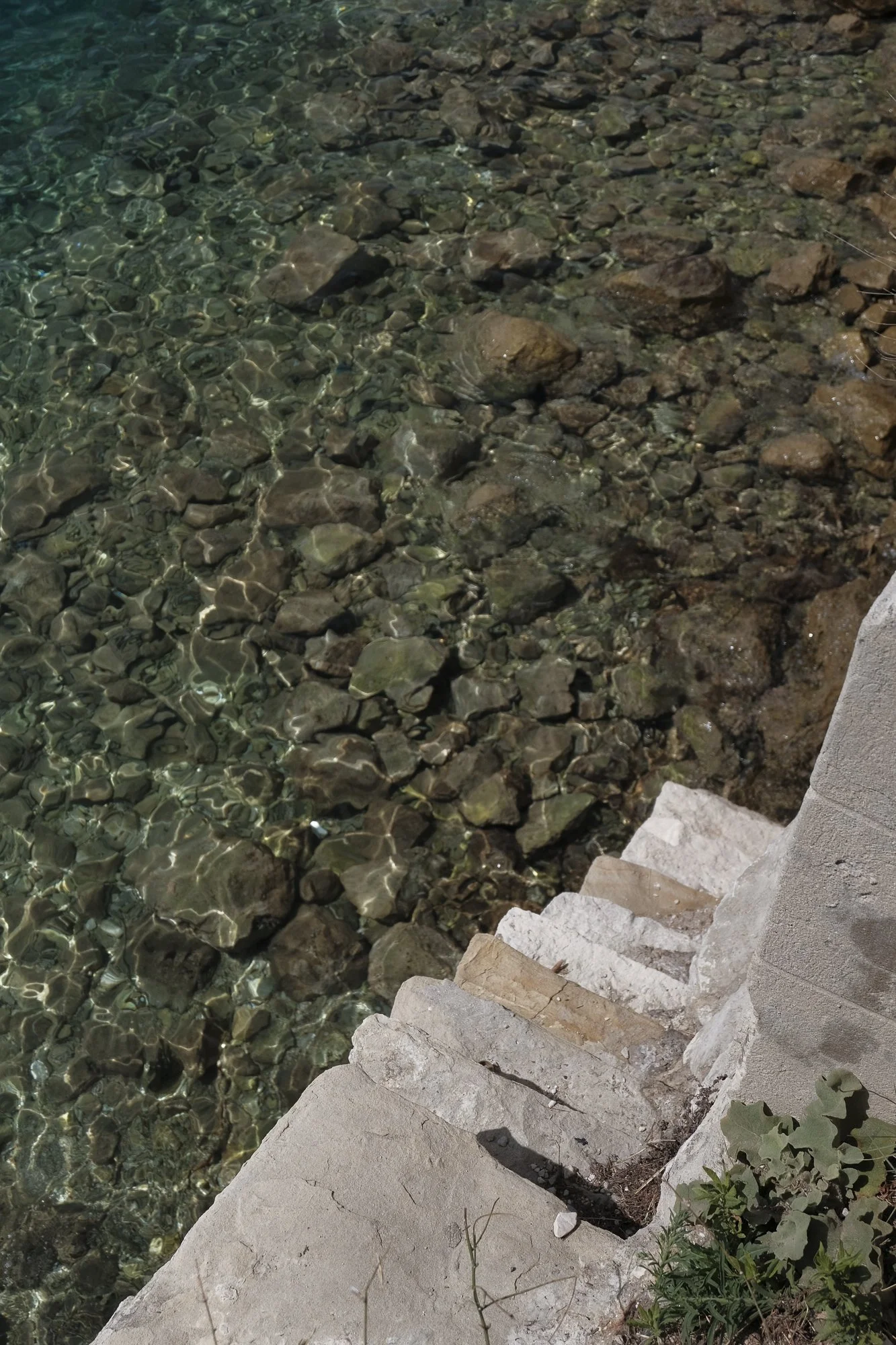 Stone steps leading down to clear, shallow water with visible rocks at the bottom.